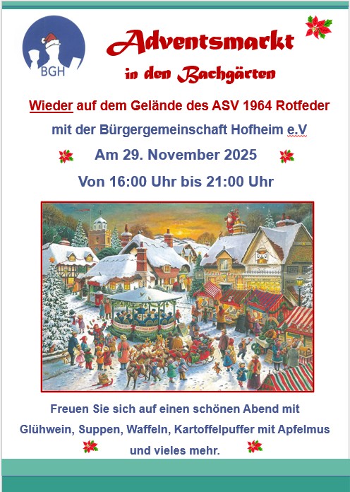 Adventsmarkt am 29.11.2025 Hinweis: der Adventsmarkt findet auf dem Gelände des ASV 1964 Rotfeder – in den Bachgärten – statt! bleibe informiert! um keine Neuerungen zu verpassen, trage Dich bei unserem Newsletter ein. Email Absenden Facebook-f Twitter Google-plus-g Pinterest Bürgergemeinschaft Hofheim e.V.1. Vorsitzender Lothar Bauerbgh@hofheim-ried.de